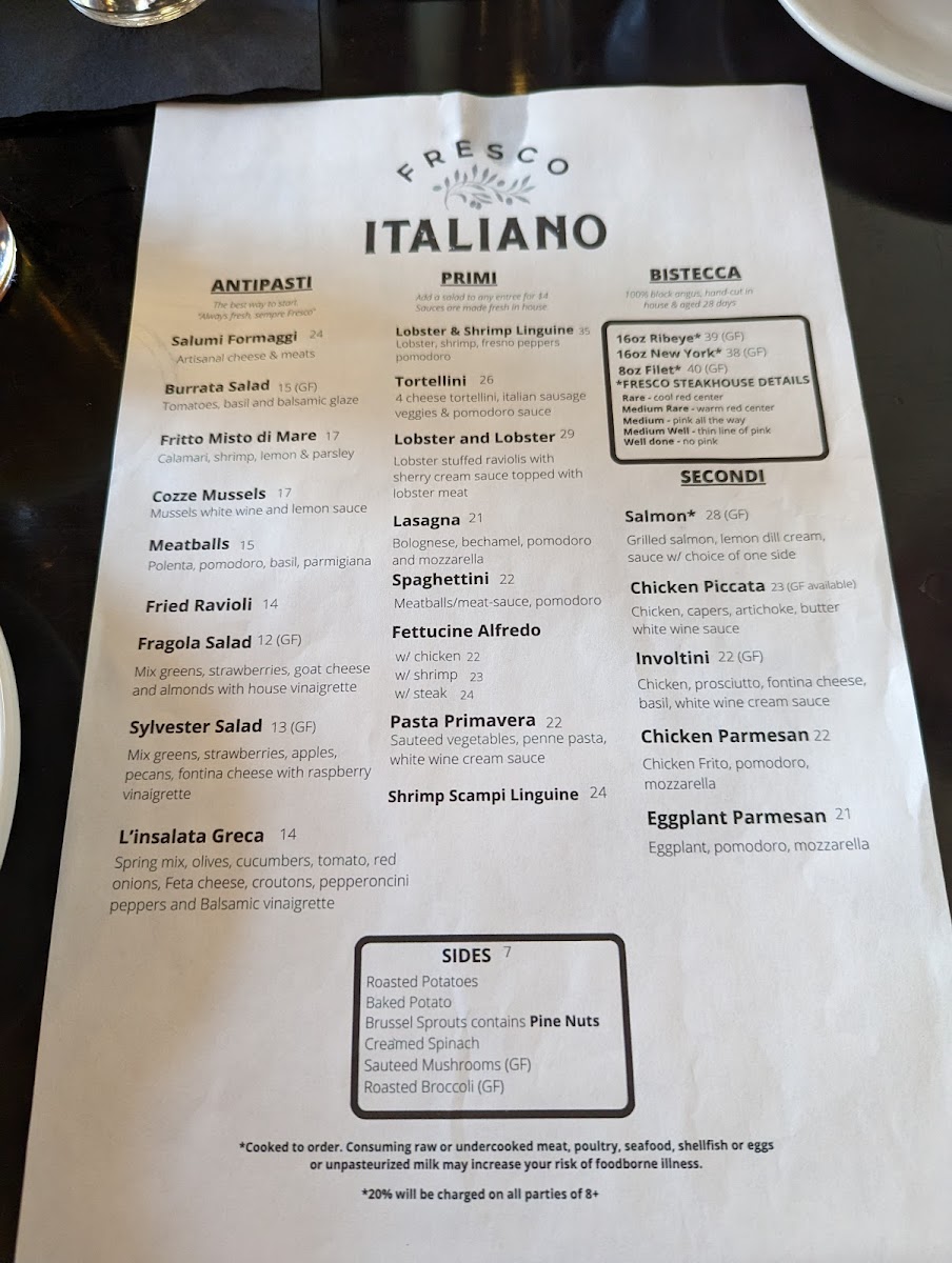 Welcome to Fresco Italiano, nestled in the heart of Tifton, Georgia. This charming Italian eatery beckons diners with a menu that fuses traditional flavors with contemporary flair. The highlight of their offerings includes delectable selections like Pasta Primavera and the luxurious Lobster & Shrimp Linguine, priced at $36.00. Vegetarians will find a delightful option in Fettucine Alfredo, while meat lovers can dive into the classic Lasagna for $22.00.